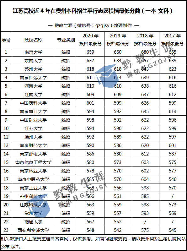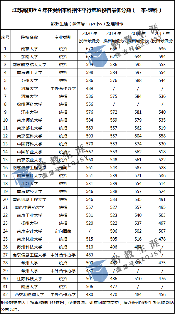 江蘇高校(一本)近4年在貴州最低投檔分