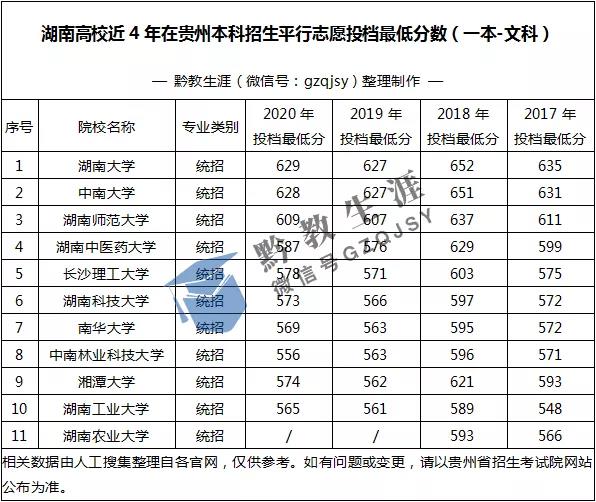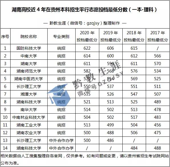 湖南高校(一本)近4年在貴州最低投檔分