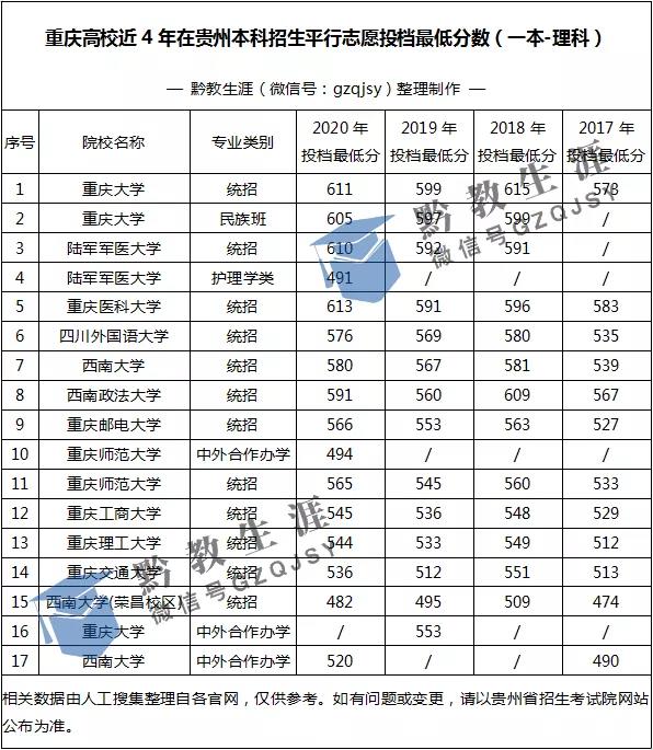 重慶高校(一本、二本)近4年在貴州最低投檔分